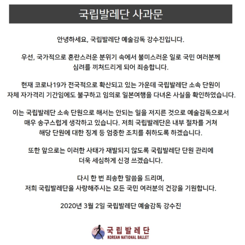 근데 이 격리기간에 단원 나대한씨가 일본 여행을 간 것이 알려졌죠. 국립발레단은 이에 자체 징계위원회를 열어 그를 해고했습니다. 관계자는 "성희롱이나 발레단 위상을 실추시키는 경우 해고를 할 수 있는데 나대한은 후자에 해당된다"라고 전했습니다.